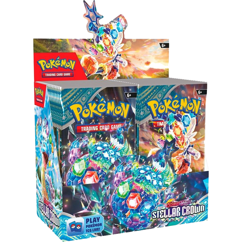 Daal af in een wereld onder de oppervlakte en ontdek de ware potentie van het Terastal fenomeen! De Legendarische Pokémon Terapagos bestijgt samen met Cinderace ex, Lapras ex en Galvantula ex de troon. Ze beschikken allemaal over briljante nieuwe krachten als Stellar Tera Pokémon ex. De pas ontdekte Hydrapple ex leidt nog meer Pokémon ex de strijd in en ACE SPEC-kaarten blijven het spel opschudden in de uitbreiding Pokémon TCG: Scarlet & Violet – Stellar Crown!